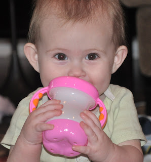 We just introduced a cup to Harper and she is a pro already. She really studies Sam when he is drinking from his cup- it is so cute. I also introduced some finger foods this week and she loves to feed herself. Look at that cute smirk once she gets the cup in her mouth- melts my heart!
